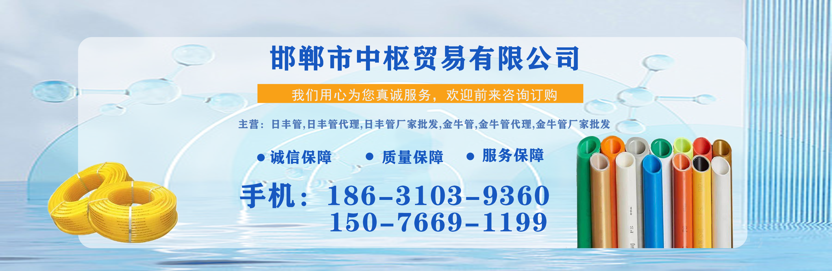 邯鄲市中樞貿易有限公司主營日豐管,日豐管代理,日豐管廠家批發,金牛管,金牛管代理,金牛管廠家批發等,質量可靠,值得信賴!  我公司在產品行業積累了豐富的經驗,具有嚴格的管理制度,同時引進先進的生產設備和生產技術,一如既往的為廣大客戶提供質優價廉的產品。創辦多年來在市場上贏得較好的口碑,銷售網絡覆蓋全國各個省市及地區?! ≠|量為先,信譽為重,管理為本,服務為誠,我們將致力于這一經營理念,關注時代發展,用先進的技術,不斷創新求實,以更優的質量,更好的服務來滿足我們的廣大客戶?! 」纠砟睿河掠谶M取、開拓創...